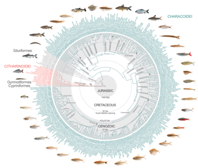 The Neotropics harbor the most species-rich freshwater fish fauna on the planet, but the timing of that exceptional diversification remains unclear. Did the Neotropics accumulate species steadily throughout their long history, or attain their remarkable diversity recently? We used 1288 ultraconserved element loci spanning 293 species, 211 genera, and 21 families of characoid fishes to reconstruct a new, fossil-calibrated phylogeny and infer the most likely diversification scenario for a clade that includes a third of Neotropical fish diversity...